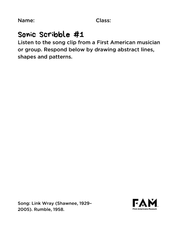 This activity is an effective bell-ringer or inquiry starter for students in visual art, social studies, or Native studies courses. A facilitator plays excerpts of the songs listed on each page of the handout. Students are prompted to listen quietly and respond by creating abstract designs that represent each song. Emphasizing abstract designs, such as patterns, shapes or squiggles, prevents learners from drawing stereotyped imagery or becoming anxious that they "cannot draw." The conversation questions at the end of the packet can be discussed as a group or in pairs. The facilitator should point out to the group that all of the artists played in class are Native, even if their music does not "sound" Indigenous. Native peoples continue to express themselves culturally and creatively in diverse ways.